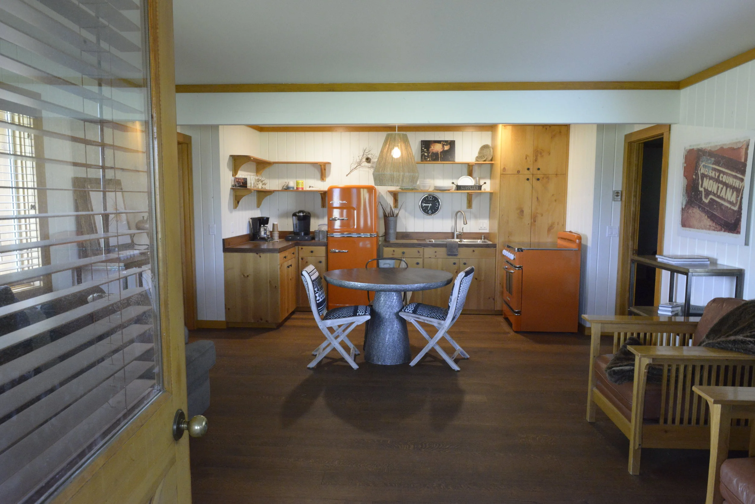 Ruby Drake Lodge features four private cabins along the Ruby River. Cabins one, two and three are decorated as large suites complete with a comfortable sitting area with a mini kitchen for coffee and relaxing, two queen beds with 5 star linens, an attractive large bathroom, and a cozy screen porch with rockers.